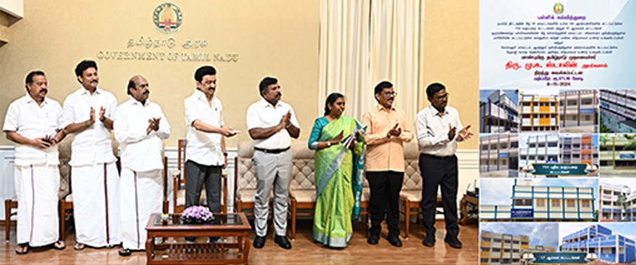 தமிழ்நாடு முதல்வர் மு.க. ஸ்டாலின் நேற்று (8.11.2024) தலைமைச் செயலகத்தில், பள்ளிக்கல்வித் துறை சார்பில், 29 மாவட்டங்களில், 141 அரசுப் பள்ளிகளில் 171.16 கோடி ரூபாய் செலவில் கட்டப்பட்டுள்ள 754 புதிய வகுப்பறைக் கட்டிடங்கள், 17 ஆய்வகக் கட்டிடங்கள் மற்றும் ஒருங்கிணைந்த பள்ளிக்கல்வியின் கீழ் கஸ்தூர்பா காந்தி பாலிகா வித்யாலயா மற்றும் நேதாஜி சுபாஷ் சந்திரபோஸ் அவிஷ்ய வித்யாலயா உண்டு உறைவிடப் பள்ளிகளுக்கான கட்டிடங்கள் ஆகியவற்றை திறந்து வைத்தார். மேலும், கருணை அடிப்படையில் 49 நபர்களுக்கு பணிநியமன ஆணைகளை வழங்கிடும் அடையாளமாக 5 நபர்களுக்கு பணிநியமன ஆணைகளை வழங்கினார்.