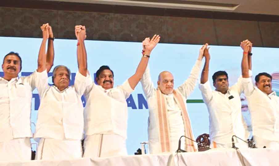 சென்னை கிண்டியில் உள்ள நட்சத்திர விடுதியில் அமித் ஷாவை, அ.தி.மு.க. தலைவர்கள் எடப்பாடி பழனிசாமி, கே.பி. முனுசாமி உள்ளிட்ட தலைவர்கள் சந்தித்துப் பேசினர். இதையடுத்து, செய்தியாளர்களைச் சந்தித்த அமித் ஷா கூறியது: “பா.ஜ.க. மற்றும் அ.தி.மு.க. தலைவர்கள் இணைந்து இந்தக் கூட்டணியை உருவாக்கி இருக்கிறார்கள். அ.தி.மு.க. -பா.ஜ.க. மற்றும் பிற கட்சிகள் இணைந்த தேசிய ஜனநாயகக் கூட்டணி 2026 சட்டப்பேரவைத் தேர்தலை எதிர்கொள்ளும். இதை அறிவிக்கவே இந்த செய்தியாளர் சந்திப்பு.
