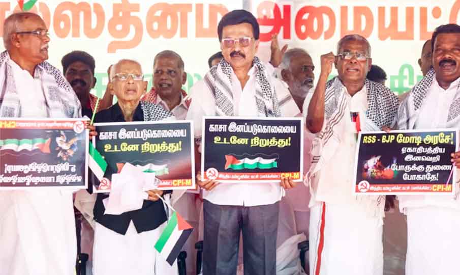 காசா மீதான இஸ்ரேலின் தாக்குதலை நிறுத்தக்கோரி மார்க்சிஸ்ட் கம்யூனிஸ்ட் சார்பில் சென்னையில் நடைபெற்ற கண்டன ஆர்ப்பாட்டத்தில் முதல்வர் மு.க.ஸ்டாலின் பங்கேற்றார். அந்த ஆர்ப்பாட்டத்தில் பங்கேற்ற பொதுமக்கள், தி.மு.க. கூட்டணி தொண்டர்கள் பாலஸ்தீனத்திற்கு ஆதரவு தெரிவித்து அந்நாட்டு கொடியுடன் பங்கேற்றனர்.