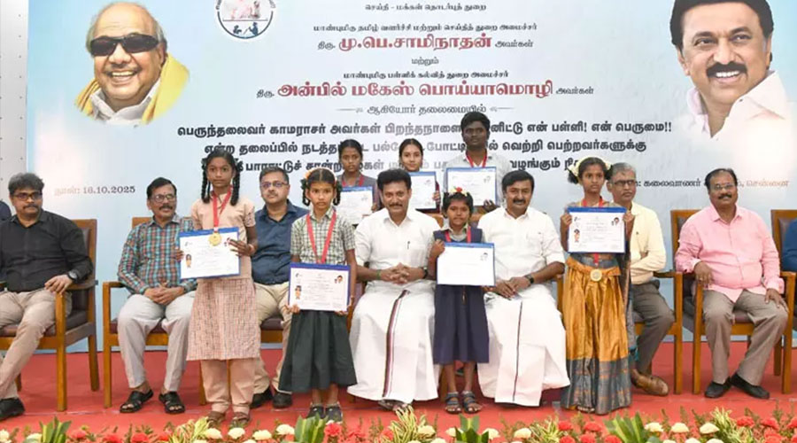 தமிழ் வளர்ச்சி மற்றும் செய்தித்துறை அமைச்சர் மு.பெ.சாமிநாதனும், பள்ளிக் கல்வித்துறை அமைச்சர் அன்பில் மகேஸ் பொய்யாமொழியும், நேற்று (16-10-2025) சென்னை கலைவாணர் அரங்கத்தில் நடைபெற்ற நிகழ்ச்சியில், “என் பள்ளி! என் பெருமை என்ற தலைப்பில் நடத்தப்பட்ட போட்டிகளில் வெற்றி பெற்ற 70 நபர்களுக்குப் பாராட்டுச் சான்றிதழ்கள் மற்றும் பதக்கங்களை வழங்கி வாழ்த்தி சிறப்பித்தார்கள். இந்நிகழ்ச்சியில் தமிழ் வளர்ச்சி மற்றும் செய்தித்துறை செயலாளர் வே. ராஜாராம், தமிழ்நாடு மாதிரி பள்ளிகள் உறுப்பினர் செயலாளர் சுதன், (ஓய்வு), பள்ளிக் கல்வித்துறை முனைவர். ச. கண்ணப்பன் கூடுதல் இயக்குநர் (மக்கள் தொடர்பு) இரா. பாஸ்கர், செய்தி மக்கள் தொடர்புத்துறை அலுவலர்கள், பள்ளிக் கல்வித் துறை அலுவலர்கள் மற்றும் ஊடக மைய அலுவலர்கள் ஆகியோர் கலந்து கொண்டனர்.