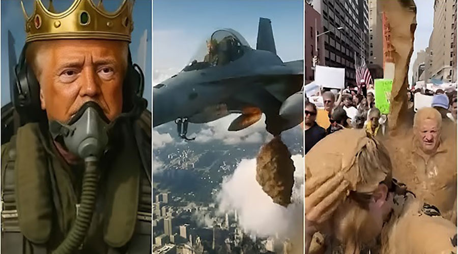 இந்த நிலையில், தனது ட்ரூத் சோஷியல் பக்கத்தில் அமெரிக்க அதிபர் டொனால்ட் ட்ரம்ப் செய்யறிவால் உருவாக்கப்பட்ட வீடியோ ஒன்றையும் பகிர்ந்துள்ளார். அந்த வீடியோவில், அரசர் ட்ரம்ப் என்று குறிப்பிடப்பட்டுள்ள போர் விமானத்தில் விமானியாக அரசர் போல கிரீடம் அணிந்து உட்கார்ந்திருக்கும் டொனால்ட் ட்ரம்ப், போராட்டத்தில் ஈடுபடுவர்கள் மீது கழிவுகளை வீசுகிறார். அப்போது டேஞ்சர் ஜோன் என்ற பாடலும் ஒலிபரப்பாகிறது.