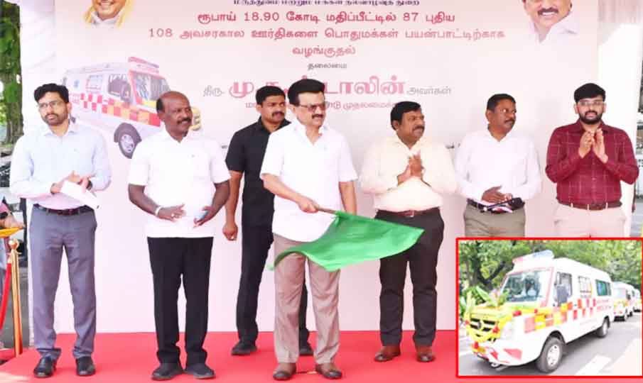ஆம்புலன்ஸ் வாகனங்களின் சேவையை மேலும் செம்மையாக செயல்படுத்தும் வகையில், தமிழ்நாடு அரசின் சார்பில் 18 கோடியே 90 லட்சத்து 46 ஆயிரம் ரூபாய் மதிப்பிலான 87 புதிய ஆம்புலன்ஸ் வாகனங்களின் சேவையினை நேற்று தமிழ்நாடு முதல்வர் கொடியசைத்து தொடங்கி வைத்தார். இவ்வாறு அதில் தெரிவிக்கப்பட்டுள்ளது.
