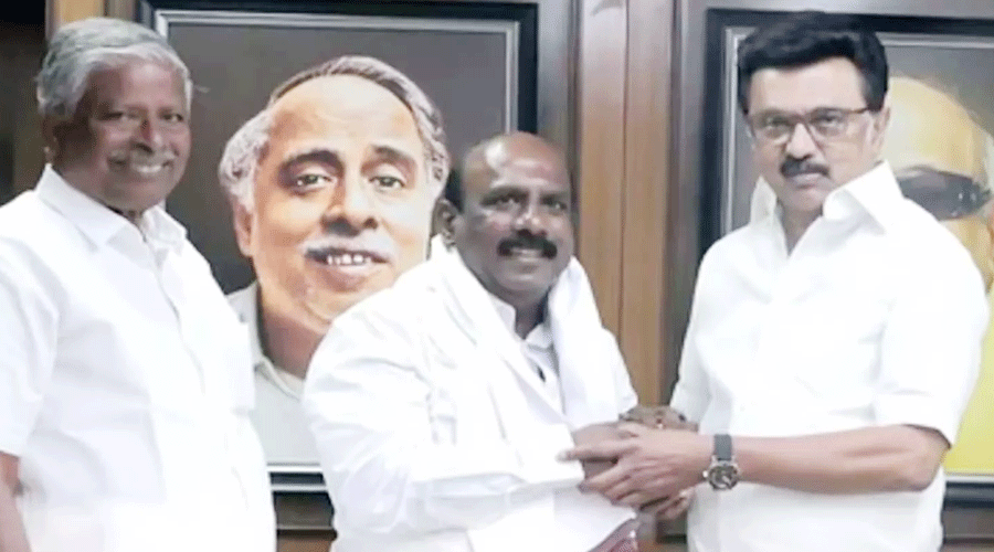 இந்த நிலையில் மனோஜ் பாண்டியன் எம்.எல்.ஏ. காலை அண்ணா அறிவாலயம் சென்று முதல்வர் மு.க. ஸ்டாலினை சந்தித்து தி.மு.க.வில் சேர்ந்தார். அவருக்கு சால்வை அணிவித்து முதல்- அமைச்சர் மு.க.ஸ்டாலின் வாழ்த்து தெரிவித்தார்.
