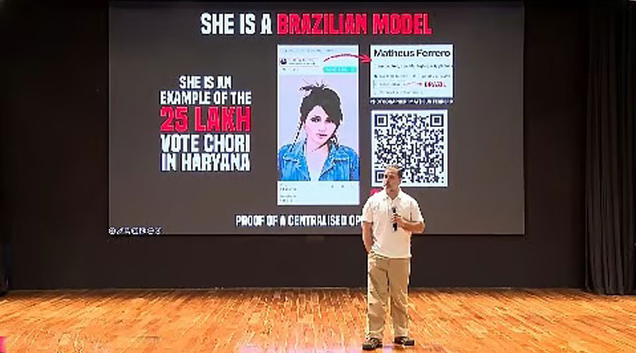 மேலும், பிரேசில் நாட்டைச் சேர்ந்த மாடல் பெண் ஒருவரின் புகைப்படத்தைப் பயன்படுத்தி பல போலி வாக்காளர்கள் உருவாக்கப்பட்டுள்ளனர். அதாவது, ஒரு புகைப்படத்தை வைத்து ஒரு தொகுதியில் 100 வாக்குகள் திருடப்பட்டுள்ளன. ஒரே நபர், ஒரே நாளில் பல வாக்குகளை அளிக்க தேர்தல் ஆணையம் எப்படி அனுமதித்தது? அரியாணாவில் தபால் வாக்குகளின் எண்ணிக்கைக்கும், எண்ணப்பட்ட தபால் வாக்குகளின் எண்ணிக்கைக்கும் பொருத்தமேயில்லை.