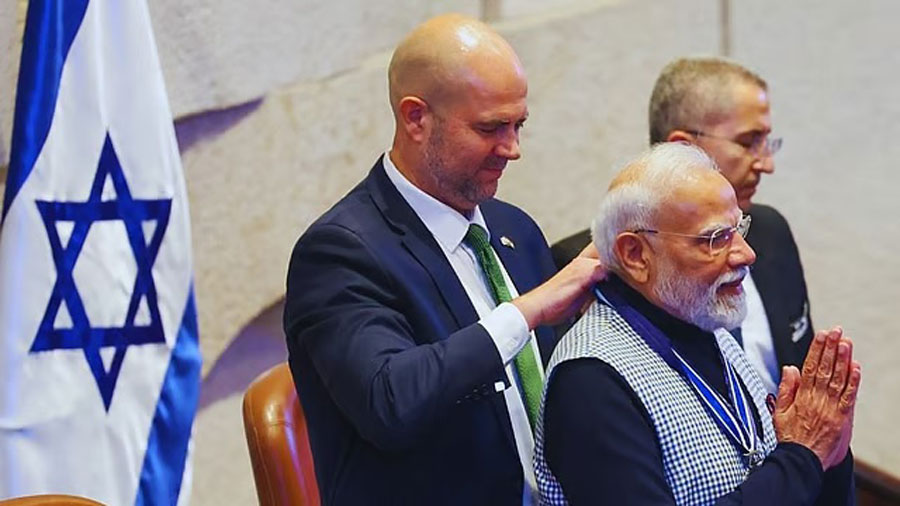 இஸ்ரேல் நாட்டுக்கு இரண்டு நாள் அரசுமுறை பயணமாக புதன்கிழமை சென்ற பிரதமர் மோடி, அந்நாட்டின் பாராளுமன்றத்தில் உரையாற்றினார். இந்தச் சொற்பொழிவின் மூலம், இஸ்ரேல் பாராளுமன்றத்தில் உரையாற்றிய முதல் இந்தியப் பிரதமா் என்ற பெருமையை மோடி பெற்றாா். அவருக்கு அந்நாட்டு பாராளுமன்றத்தின் மிக உயரிய பதக்கம் அளிக்கப்பட்டது.