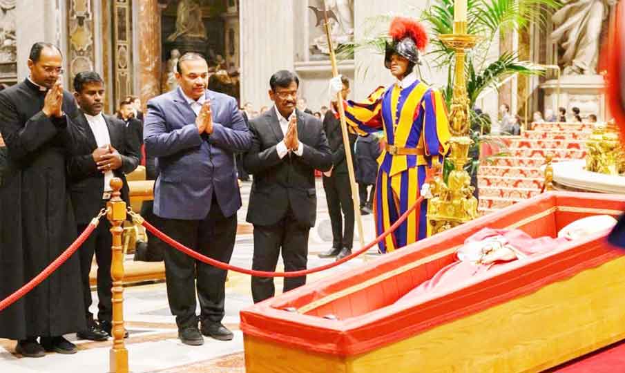 வாடிகன் சிட்டி : புனித பீட்டர் பேராலயத்தில் வைக்கப்பட்டுள்ள போப் ஆண்டவர் உடலுக்கு தமிழ்நாடு அரசு சார்பில் அஞ்சலி செலுத்தப்பட்டது.