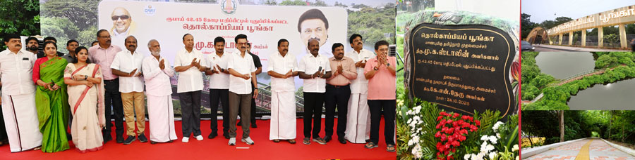 சென்னை ராஜா அண்ணாமலைபுரத்தில் உள்ள தொல்காப்பியப் பூங்காவை முதல்வர் மு.க.ஸ்டாலின் திறந்து வைத்தார். 58 ஏக்கரில் உள்ள தொல்காப்பிய பூங்காவில் புதிய நுழைவு வாயில், கண்காணிப்பு கோபுரம், பார்வையாளர் மாடம், குழந்தைகளுக்கான விளையாட்டுப் பகுதி உள்ளிட்ட பல்வேறு நவீன வசதிகளுடன் இந்தப் பூங்கா புதுப்பிக்கப்பட்டுள்ளது.