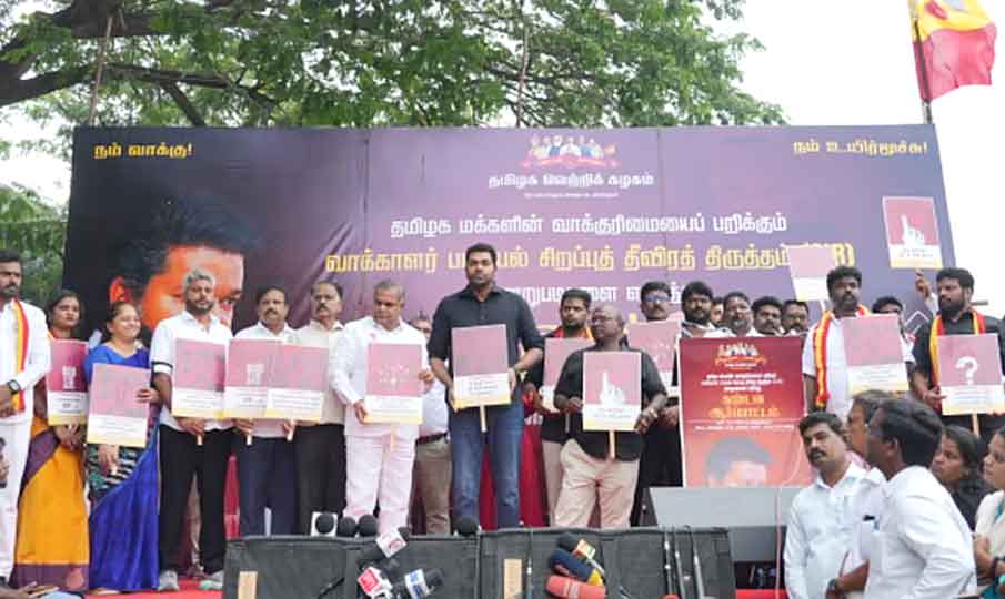 இந்த நிலையில் இதனைக் கண்டித்து த.வெ.க. சாா்பில், மாவட்டத் தலைநகரங்களில் ஞாயிற்றுக்கிழமை (நவ.16) ஆா்ப்பாட்டம் நடத்தப்படும் என அறிவிக்கப்பட்டிருந்தது. அதன்படி, சென்னை சிவானந்தா சாலையில் நடைபெற்ற ஆர்ப்பாட்டத்தில் கட்சியின் பொதுச் செயலாளர் என். ஆனந்த் மற்றும் ஆதவ் அர்ஜுனா உள்ளிட்டோர் பங்கேற்றனர்.