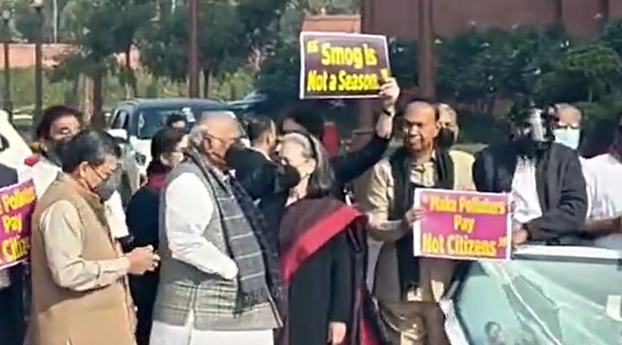 டெல்லி, டெல்லி காற்று மாசுபாட்டை தடுக்க நடவடிக்கை எடுக்கக் கோரி பாராளுமன்ற வளாகத்தில் நேற்று எதிர்க்கட்சி எம்.பி.க்கள் முகக்கவசம் அணிந்து ஆர்ப்பாட்டம் நடத்தினர்.
