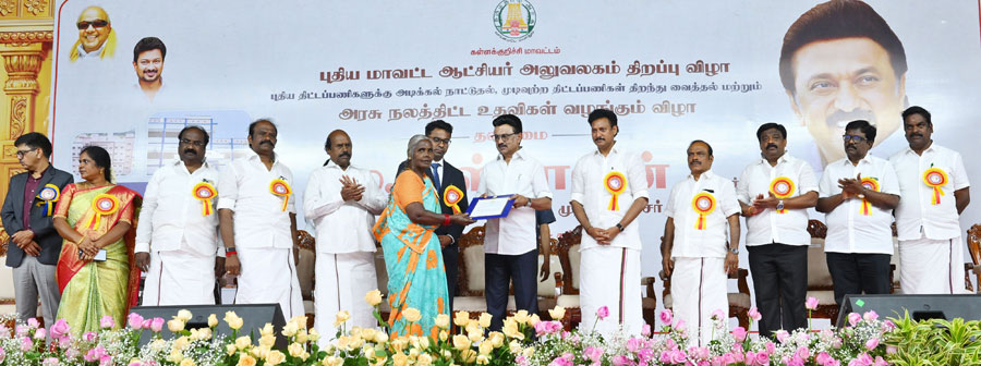 கள்ளக்குறிச்சி மாவட்டம், வீரசோழபுரத்தில் கட்டப்பட்டுள்ள மாவட்ட ஆட்சியரகத்தின் புதிய கட்டிடத்தை வெள்ளிக்கிழமை காலை திறந்து வைத்த முதல்வர் மு.க.ஸ்டாலின், தொடர்ந்து நடைபெற்ற அரசு விழாவில் முடிவுற்ற பணிகளைத் திறந்து வைத்தும், பல்வேறு பணிகளுக்கு அடிக்கல் நாட்டியும் பேசினார். இதையடுத்து நலத்திட்ட உதவிகளையும் அவர் வழங்கினார்.