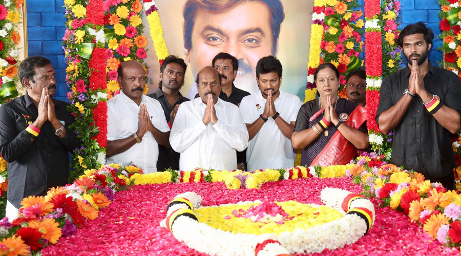 சென்னை, மறைந்த தே.மு.தி.க. தலைவர் விஜயகாந்தின் 2-ம் ஆண்டு குருபூஜையையொட்டி சென்னை கோயம்பேட்டில் உள்ள அவரது நினைவிடத்தில் அரசியல் கட்சி தலைவர்கள் மரியாதை செலுத்தினர்.