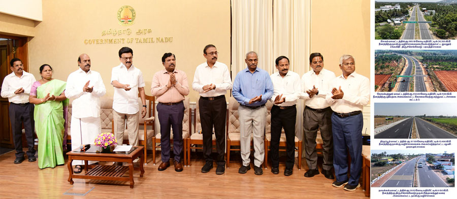 திருப்பூர் மாவட்டத்தில் 87 கோடியே 69 லட்சம் ரூபாய் செலவில் 13.49 கி.மீ நீளத்திற்கும் நான்கு வழிச்சாலையாக அகலப்படுத்தி உறுதிபடுத்தப்பட்ட பழனி - தாராபுரம் சாலை; திருவாரூர் மாவட்டத்தில் 68 கோடி ரூபாய் செலவில் 5.61 கி.மீ நீளத்திற்கும் (கட்டம்-1, பகுதி-A) மற்றும் 56 கோடி ரூபாய் செலவில் 6.29 கி.மீ நீளத்திற்கும் (கட்டம்-1, பகுதி-B) என இருப்பகுதிகளாக மன்னார்குடி - திருமாக்கோட்டை - சொக்கணாவூர் சாலை மற்றும் தஞ்சாவூர் - மன்னார்குடி - திருத்துறைப்பூண்டி - வேதாரண்யம் - கோடியக்கரை சாலையை இணைக்கும் வகையில் இரு வழிச்சாலையாக புதியதாக அமைக்கப்பட்டுள்ள மன்னார்குடி சுற்றுவட்ட சாலை; என மொத்தம் 1843 கோடியே 85 லட்சம் ரூபாய் செலவில் அமைக்கப்பட்டுள்ள 11 சாலைகளை முதல்வர் மு.க.ஸ்டாலின் நேற்று திறந்து வைத்தார். இவ்வாறு அதில் தெரிவிக்கப்பட்டுள்ளது.